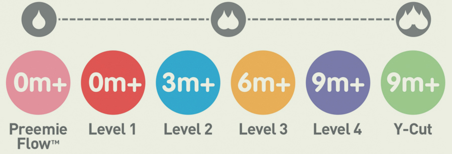 There are four basic baby-bottle nipple types: regular nipple with slow, medium or fast flow (the number and size of the holes will determine flow). When you notice any of these signs, it usually means that the baby is not getting a fast enough flow and it is time to move up a level: